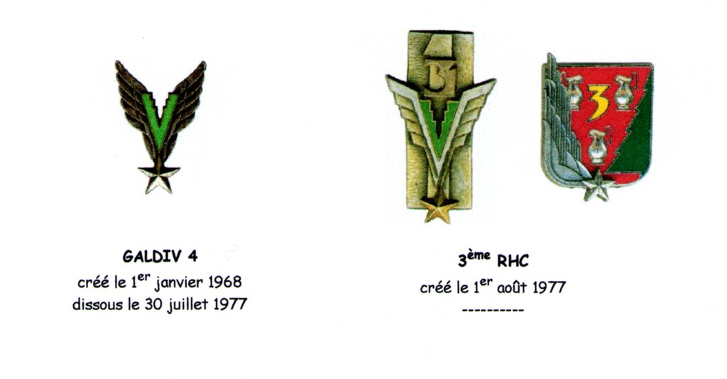 Le 21 juin 1977, cette insigne est officiellement homologuée sous le numéro G 2537. Elle devient alors la première insigne du 3e RHC, conçue à l’initiative du lieutenant-colonel KERRAND, alors commandant du GALDIV 4, et dessinée par l’adjudant LOTHELAIN.