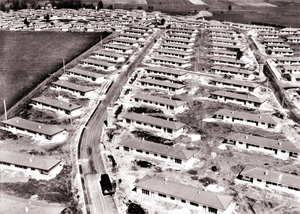 Mi juin 1958, un second ensemble de 382 pavillons, « les Clairs Chênes », fut aménagé au nord d’Étain. Ce vaste bourgeonnement aux formes organiques, détaché du tissu urbain, est aisément reconnaissable au premier plan de la photographie. Au nord de Toul, Régina village et la cité Saint Michel préfiguraient les lotissements périurbains. Ils ont été depuis rattrapés par l’extension urbaine de la ville.